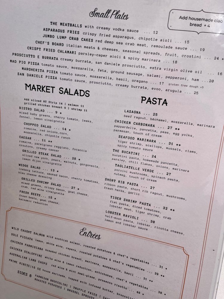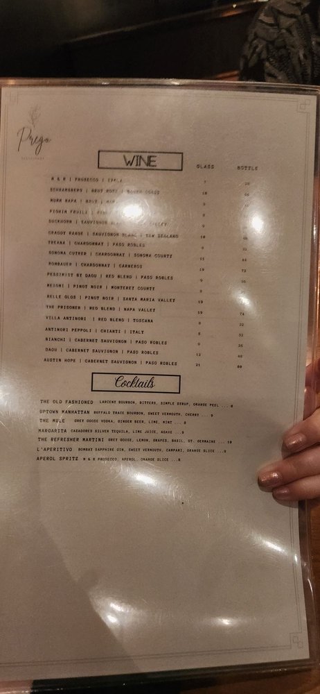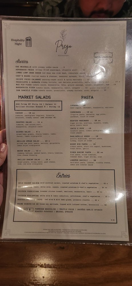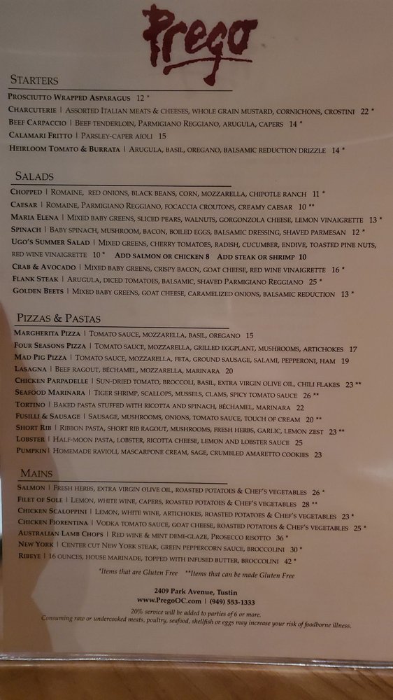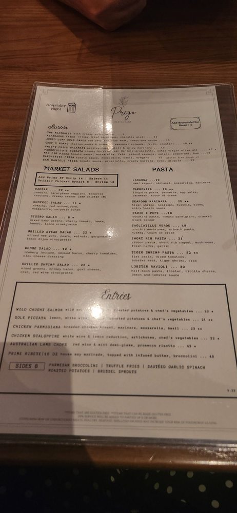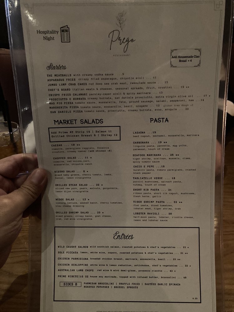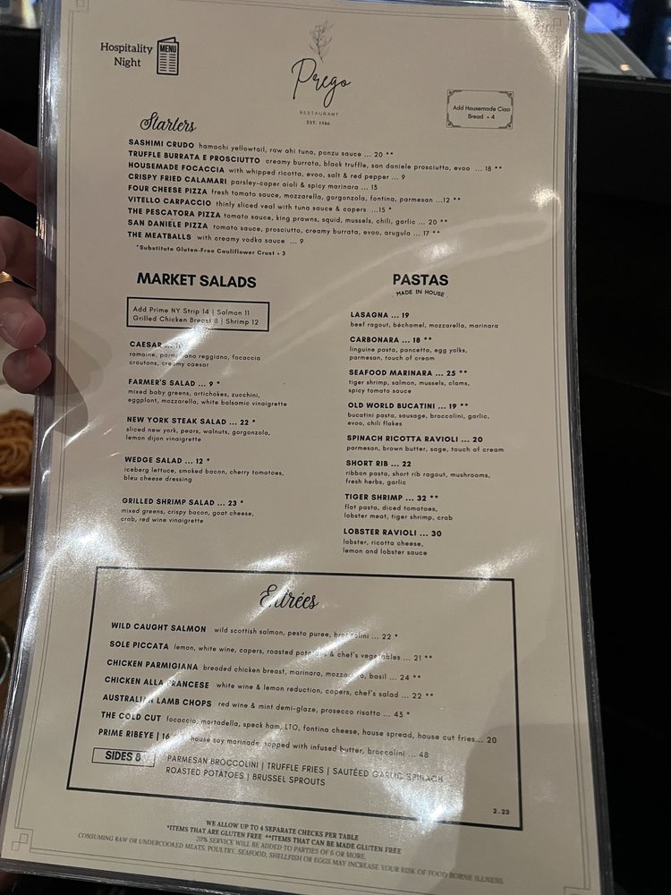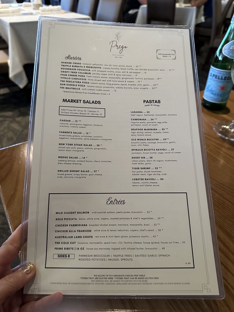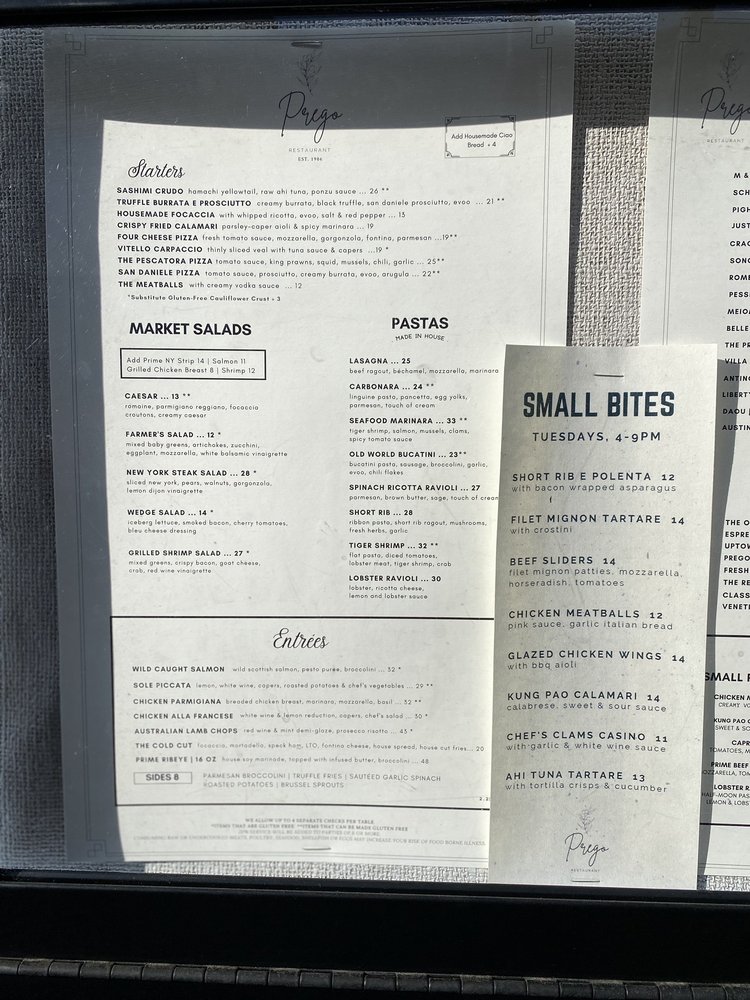 Prego Restaurant Menu